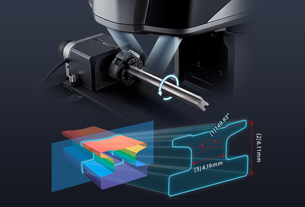 表面 3D 輪廓量測(cè)儀「VR-6000 系列」以非接觸方式實(shí)現(xiàn)粗糙度儀、輪廓形狀測(cè)量?jī)x的量測(cè)。此 3D 輪廓量測(cè)儀可以使用 0.1 μm解析度掌握觸針式無(wú)法完全量測(cè)的面整體形狀。全新搭載了電動(dòng)旋轉(zhuǎn)裝置。藉由一邊旋轉(zhuǎn)樣品一邊量測(cè),無(wú)死角呈現(xiàn)真實(shí)的截面形狀。輕鬆量測(cè)以往必須截?cái)嗖拍苷_量測(cè)的部位厚度及深度尺寸。掃描能力透過 HDR 掃描演算法進(jìn)化,針對(duì)光學(xué)式輪廓量測(cè)儀不易量測(cè)的光澤表面及較弱的反射材料目標(biāo)物,亦可以瞬間判斷最佳條件,準(zhǔn)確量測(cè)形狀。動(dòng)態(tài)掃描範(fàn)圍最高可達(dá)以往的 1000 倍。