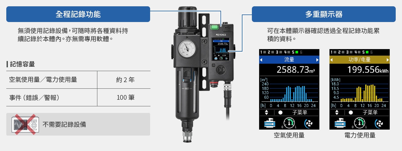 FD-EP 系列在小型機體內(nèi)內(nèi)建流量感測器與壓力感測器,可輕鬆診斷空壓元件的狀態(tài)。搭載專用應用模式,可輕鬆實現(xiàn)氣缸、吸附搬運、在席及吹氣的預防維護。即時捕捉並診斷空壓元件的狀態(tài)。還採用完全貫通結(jié)構(gòu),管道中沒有可能導致壓力損失或堵塞的突起物或障礙物。從微小流量到大流量皆可支援,僅需「選擇管徑」即可選型。顯示放大器搭載高解析度顯示器,無需操作手冊即可直觀操作。產(chǎn)品陣容還包括可減少安裝工時的裝設支架。氣缸前進/後退、吸附搬運中的吸附/真空破壞等會發(fā)生正向反向流動的應用案例也僅需一臺即可全部對應。